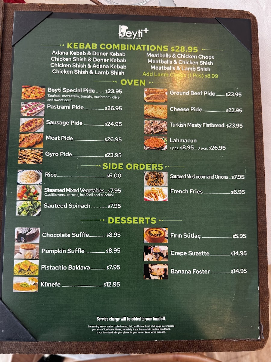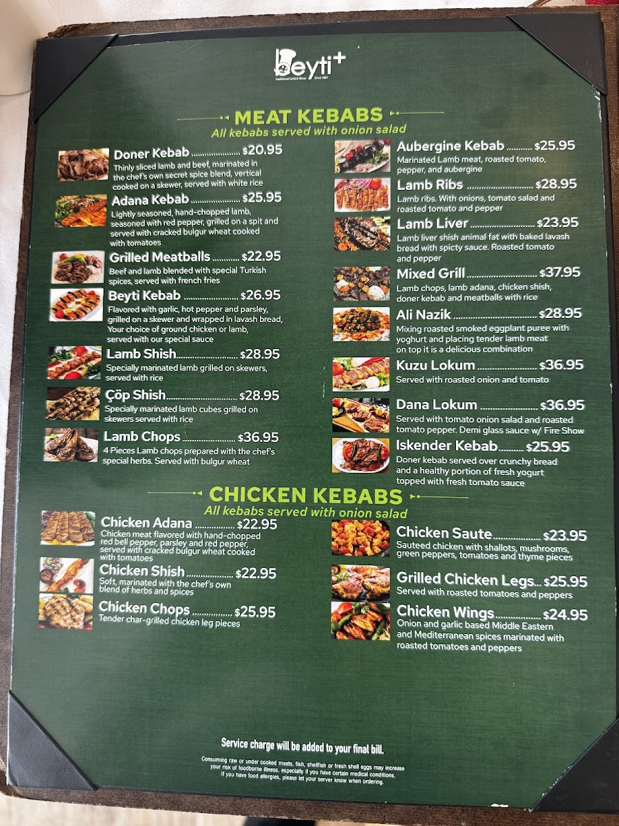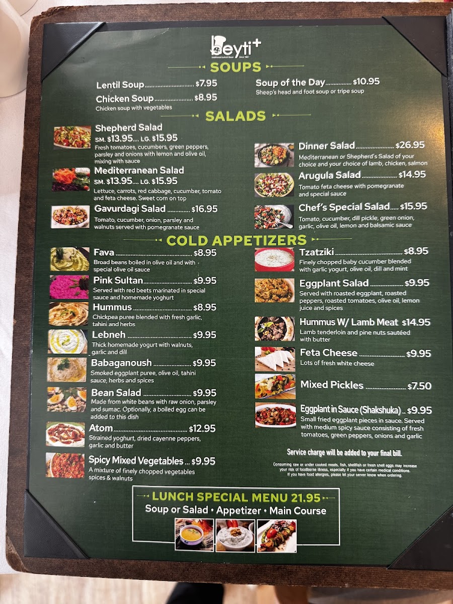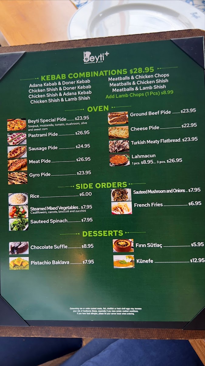 In summary, Beyti Kebab offers a well-rounded menu with something for everyone, from hearty entrees to light salads, and indulgent desserts. The prices are reasonable, considering the quality and authenticity of the food, making it a great choice for anyone in the area.