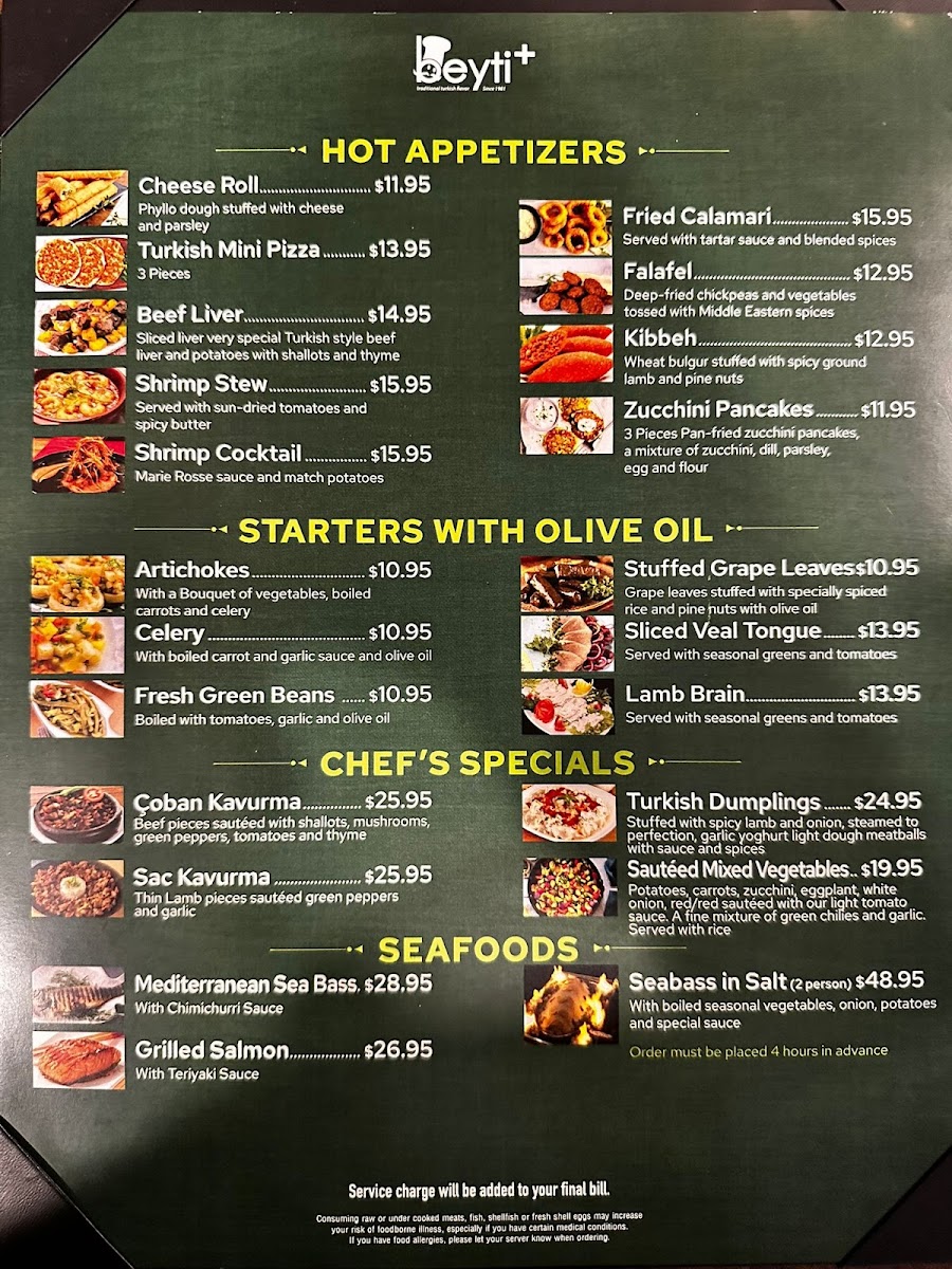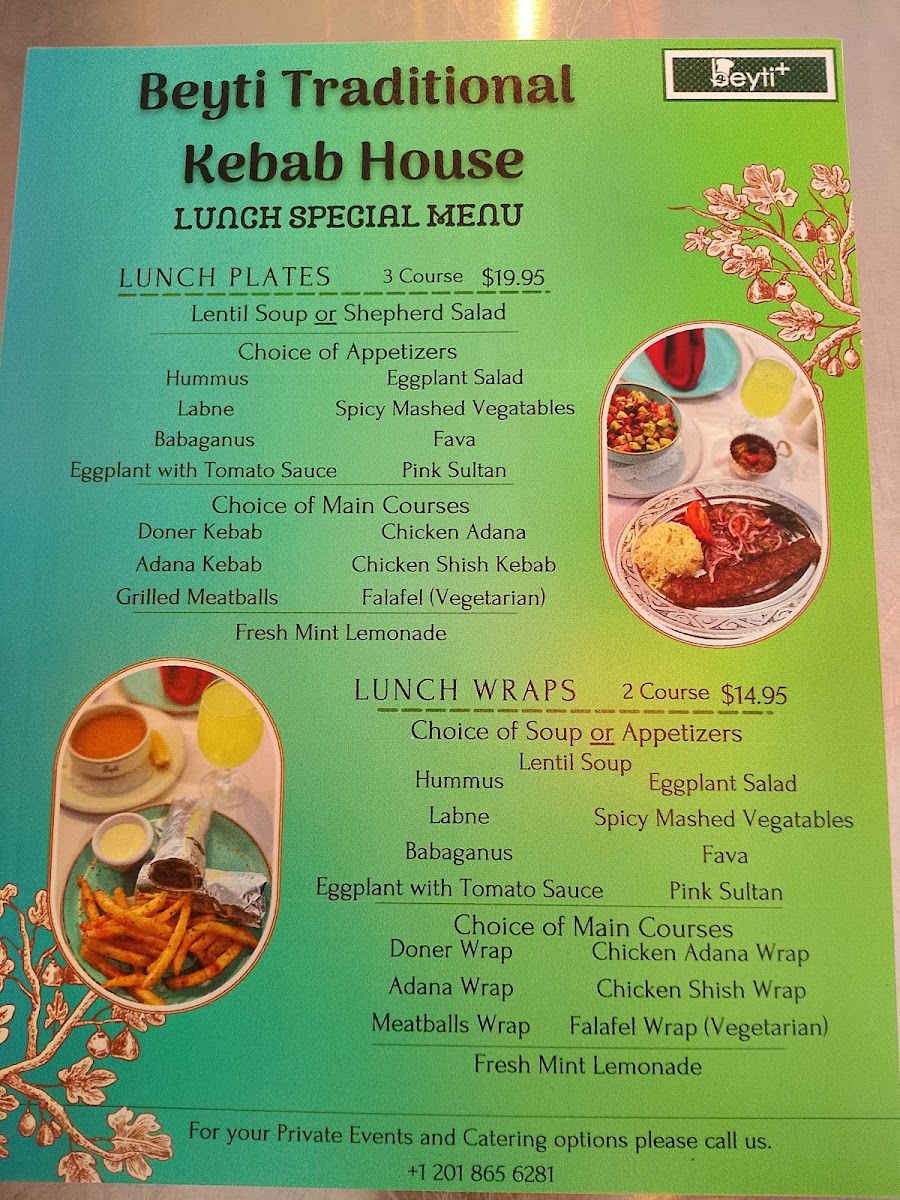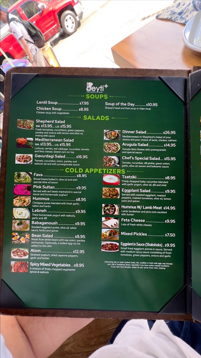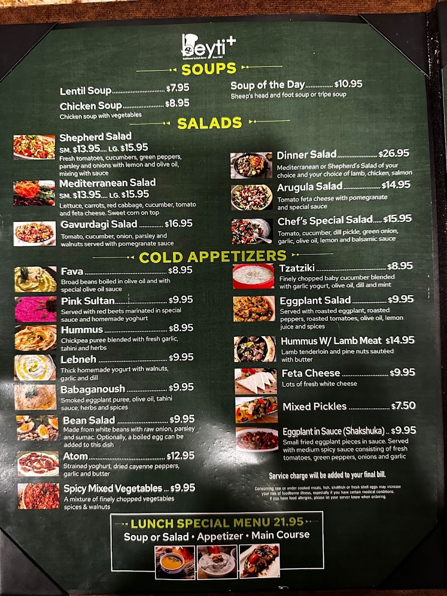 In summary, Beyti Kebab offers a well-rounded menu with something for everyone, from hearty entrees to light salads, and indulgent desserts. The prices are reasonable, considering the quality and authenticity of the food, making it a great choice for anyone in the area.